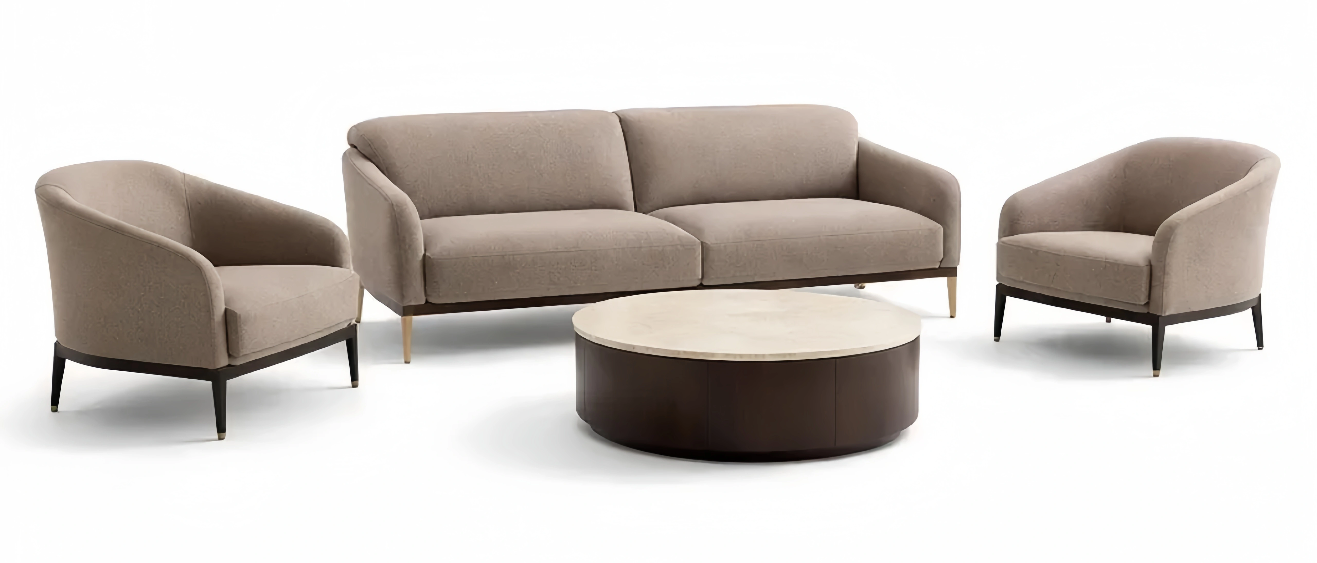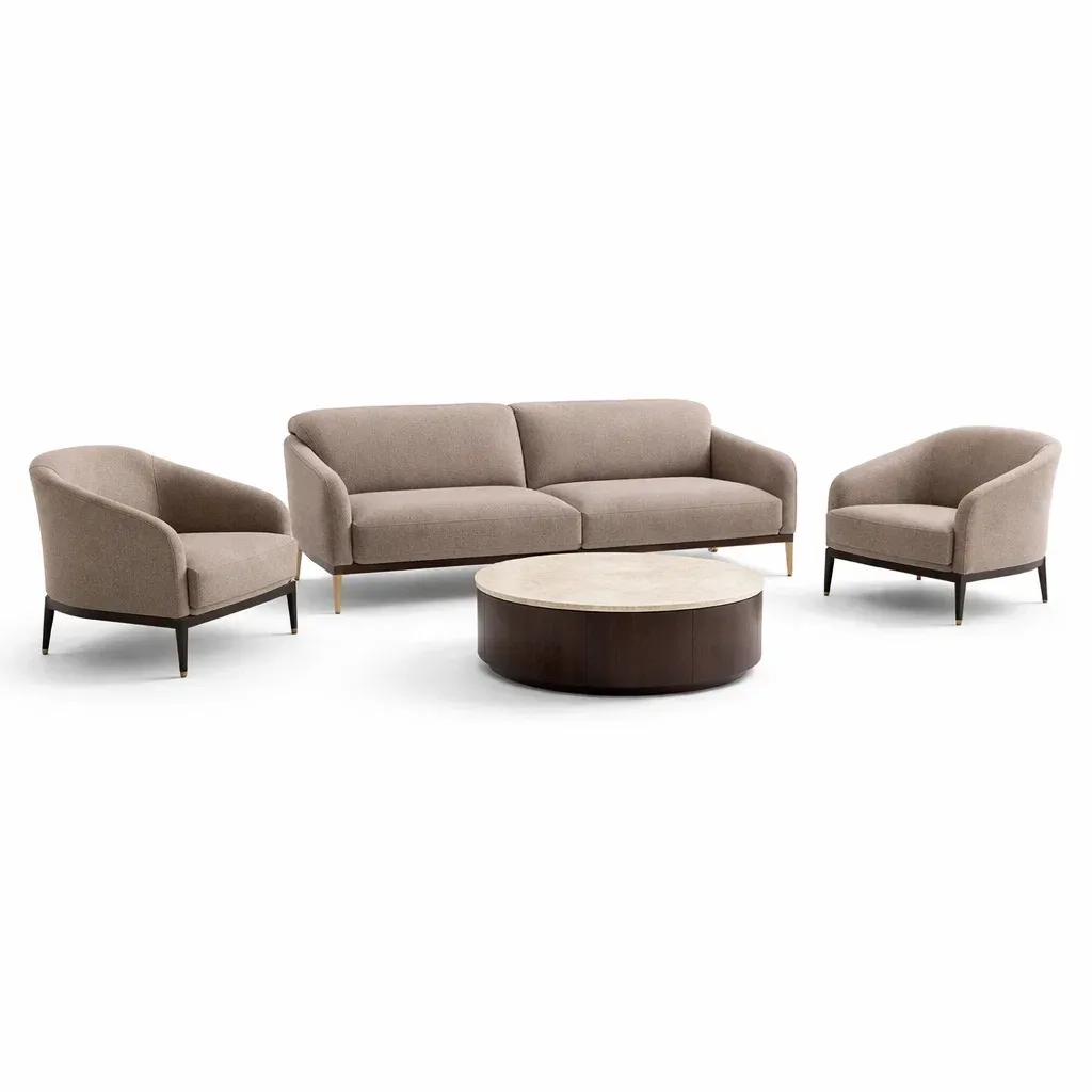 Set di divani in Tessuto Beige con Poltrone e Tavolino Rotondo in Legno